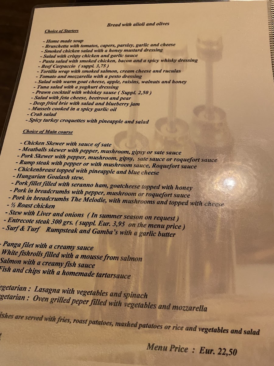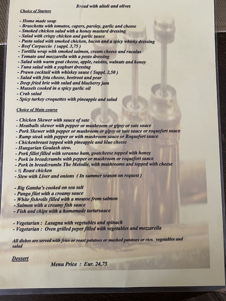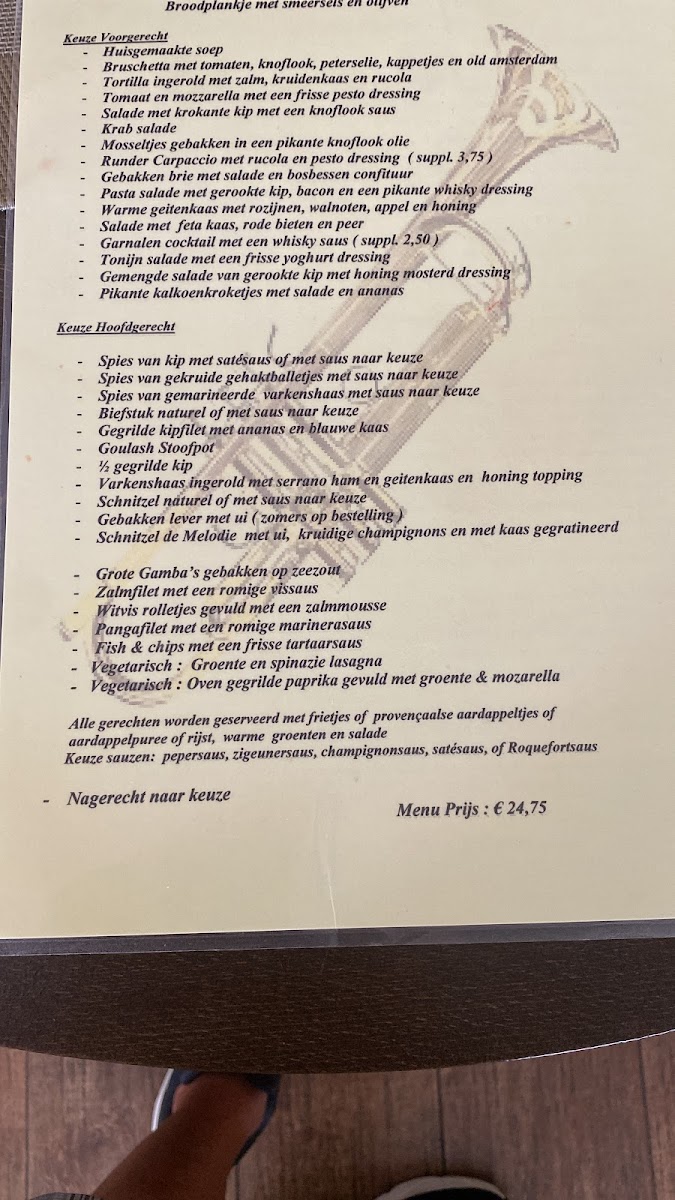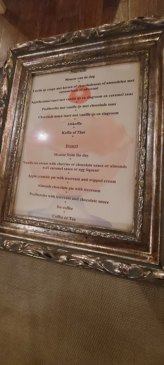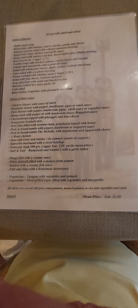 Dessert is where the Bistro truly shines, with the Apple Crumble Pie with Ice Cream and Whipped Cream delivering a warm, comforting finish to the meal, while the Profiteroles provide a rich and indulgent treat. The Warme Geitenkaas offers a warm goat cheese option for those looking for a savory note to end their meal. For those wanting a savory bite to nibble on, the Kalkoenkroketjes are a perfect choice, delivering a crispy, hearty snack. All in all, Bistro De Melodie Sl offers a diverse and satisfying menu, ensuring every guest leaves with a smile.